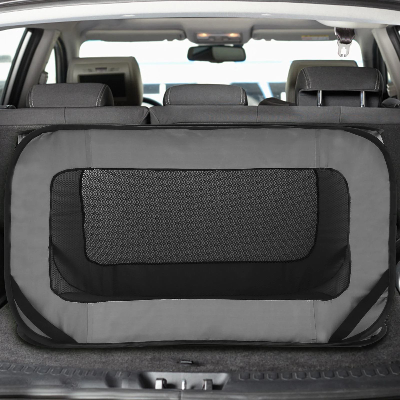 [High Quality Oxford Cloth and Mesh] This foldable pop up dog crate is made of high quality Oxford cloth, mesh and steel wire for long-lasting durability. It comes with a zip mesh door and mesh side windows for improved visibility and ventilation to keep your pet comfortable.